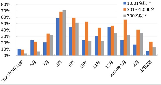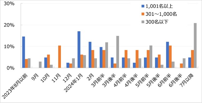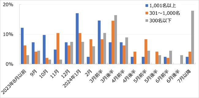 内定出し(内々定出し)の開始予定時期については、大企業では「2024年1月」が最多で17%となっており、2月までには半数が内定出しの開始を予定している。また、中堅企業では、「2023年11月」が10%で最も多く、2月までには38%が開始を予定している。中小企業では、「2024年7月以降」が21%で最も多く、2月までに開始を予定しているのは24%にとどまる。