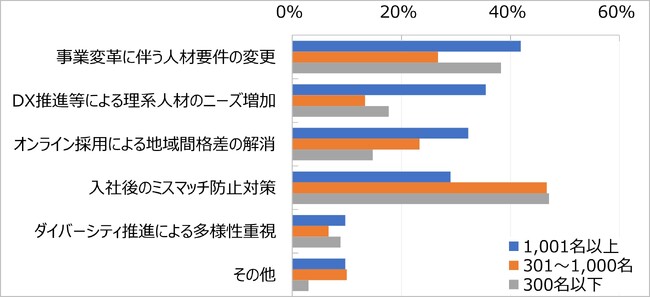 ターゲット層が変化している理由としては、大企業では「事業変革に伴う人材要件の変更」が最多で42%、中堅・中小企業では「入社後のミスマッチ防止対策」が最多でともに47%となっている。