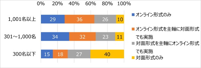 最終面接以外の一次面接や二次面接などでの実施形式の傾向を見ると、大企業と中堅企業では「オンライン形式のみ」もしくは「オンライン形式を主軸に対面形式でも実施」の割合が高く、これらを合計した割合はそれぞれ64%、66%と6割以上でオンライン形式が主流となっている。一方、中小企業では「対面形式のみ」が最多で40%、次いで「対面形式を主軸にオンライン形式でも実施」が27%となっており、大企業や中堅企業とは異なり対面形式をメインとした採用面接となっている。