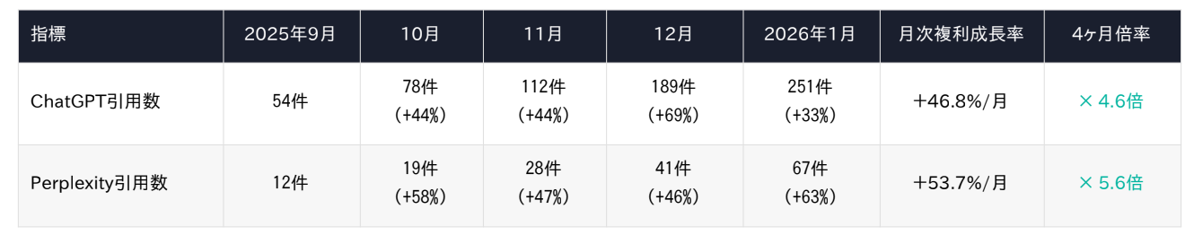 Google検索順位と並行して、ChatGPT・Perplexityなど生成AI検索への引用数も追跡しました。