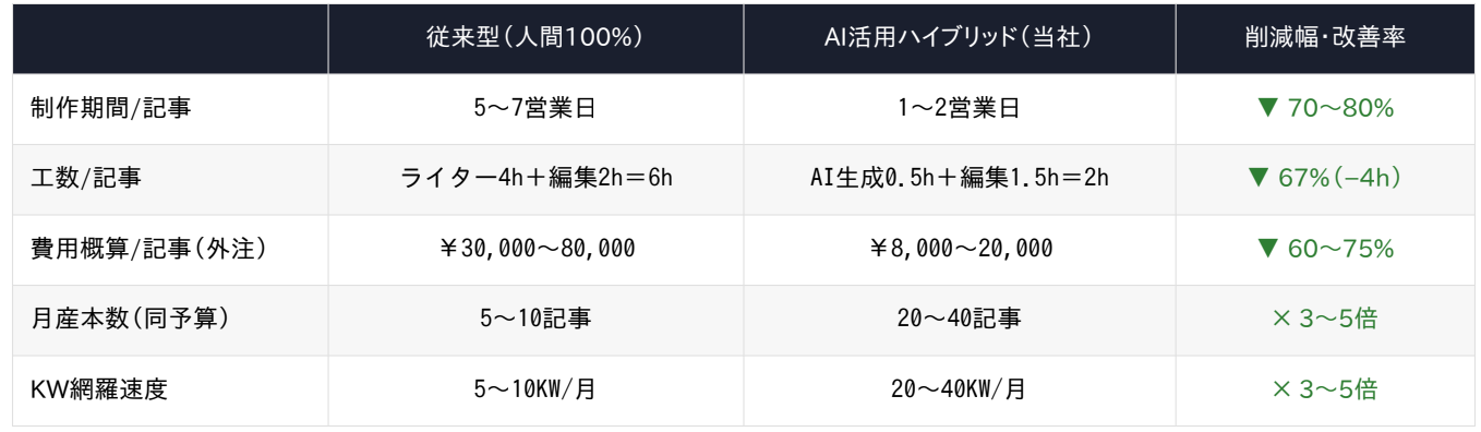 ※費用は社内工数の時給換算参考値。AI活用でも編集工数(E-E-A-T担保)の省略は不可。