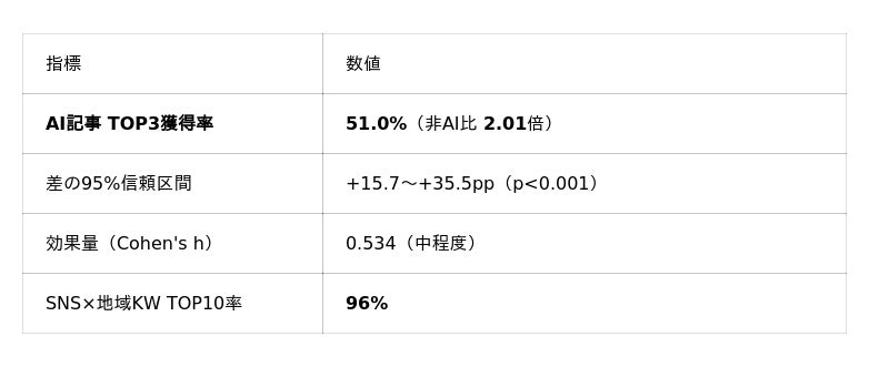 TOP3率(z=+5.63, p<0.001, h=0.534)・TOP10率(z=+3.70, p<0.001, h=0.387)は統計的に有意な差を確認。一方、TOP20率(z=+1.83)・圏外率(z=−0.50)は有意差なし(n.s.)。AI記事の優位性は「上位への集中」に特徴があり、中〜下位圏での差は統計的に確認されていない。
