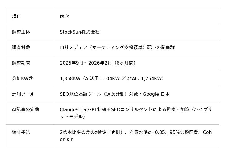 StockSun株式会社(本社:東京都新宿区、代表取締役:岩野 圭佑)は、自社オウンドメディア(マーケティング支援領域)のAI活用記事104KW・非AI記事1,254KW、計1,358キーワードのGoogle検索順位を6ヶ月間追跡した結果を公開します。