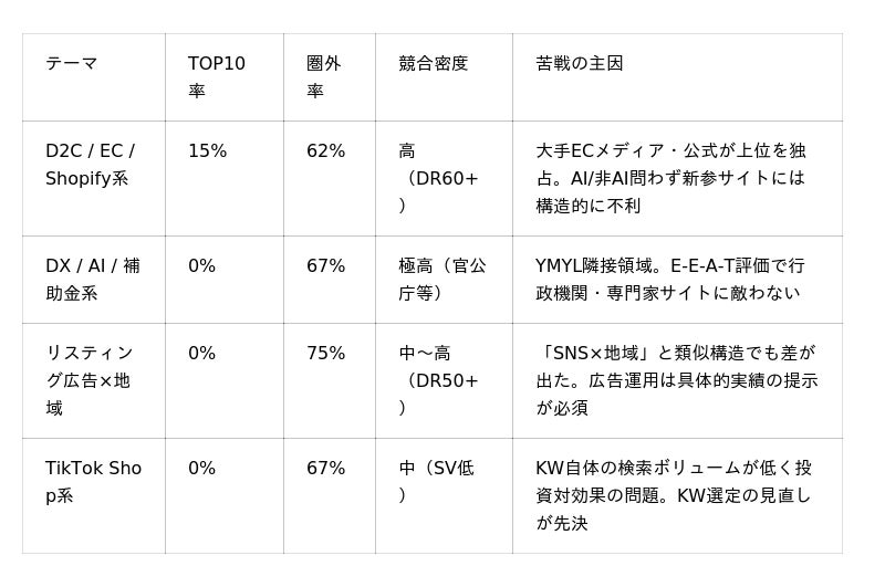 D2C・DX・リスティング広告系テーマの圏外化は、競合ドメインのDRが70〜90超であること、YMYL隣接領域であること、官公庁・大手コンサルが上位を独占していることが主因です。これらは人間ライターで制作しても同様の結果になる可能性が高く、「AI記事だから負けた」ではなく「KW選定・ドメイン権威性の問題」として分離して考える必要があります。