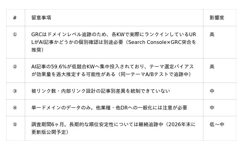本調査はAI記事を意図的に「勝ちやすいKW属性」へ優先投入しています。上記3つの交絡因子がAI記事に有利な方向に働いており、51.0% vs 25.4%の差の一部は投入KWの属性差に起因する可能性があります。 真の因果効果を検証するには、同一テーマ・同一KWでのA/Bテスト的比較が必要であり、現在設計中です。