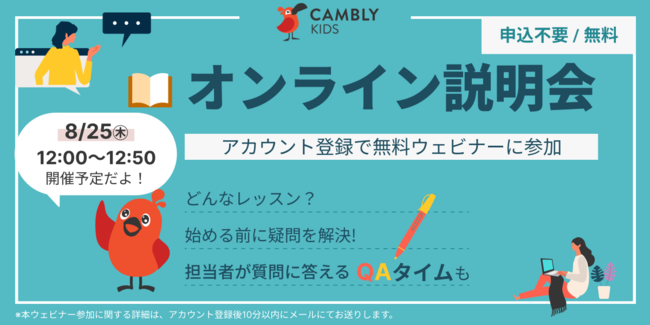Cambly Inc.(本社:アメリカ・サンフランシスコ、日本代表:佐藤 亜希子)が提供する子ども向けオンライン英会話サービス「Cambly Kids(キャンブリー キッズ)」は、8月25日(木)に初の無料ウェビナー「オンライン説明会」を開催いたします。