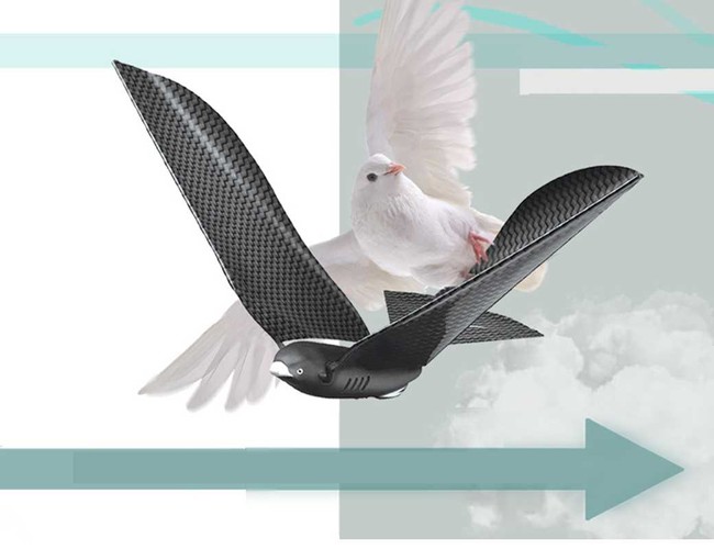 自然の生物の機能を模したバイオミティクス(生物模倣)と呼ばれる考え方に基づき開発され、柔軟性のあるプラスチックを使った本体はたった9.5g=100円玉たった2枚分しかありません。約150m範囲で通信可能でアルミラジエーターを備えたメインモーターは、機械的なノイズがほとんど聞こえず飛んでいる姿は本物の鳥と全く同じように見えます。