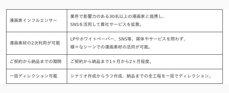 マンガPRサービス以外にも、漫画制作納品、SNSキャンペーンなどのメニューもございます。