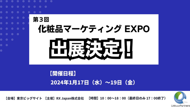 株式会社リンクアンドパートナーズは、2024年1月17日(水)〜19日(金)に東京ビックサイト(所在地:東京都江東区)で開催される【第14回COSME Week 東京】内の「第3回 化粧品マーケティング EXPO」に出展いたします。