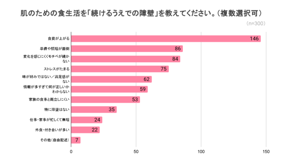 肌のための食生活を続けるうえでの障壁として、「食費が上がる」が146回答と群を抜いて高い結果となりました。