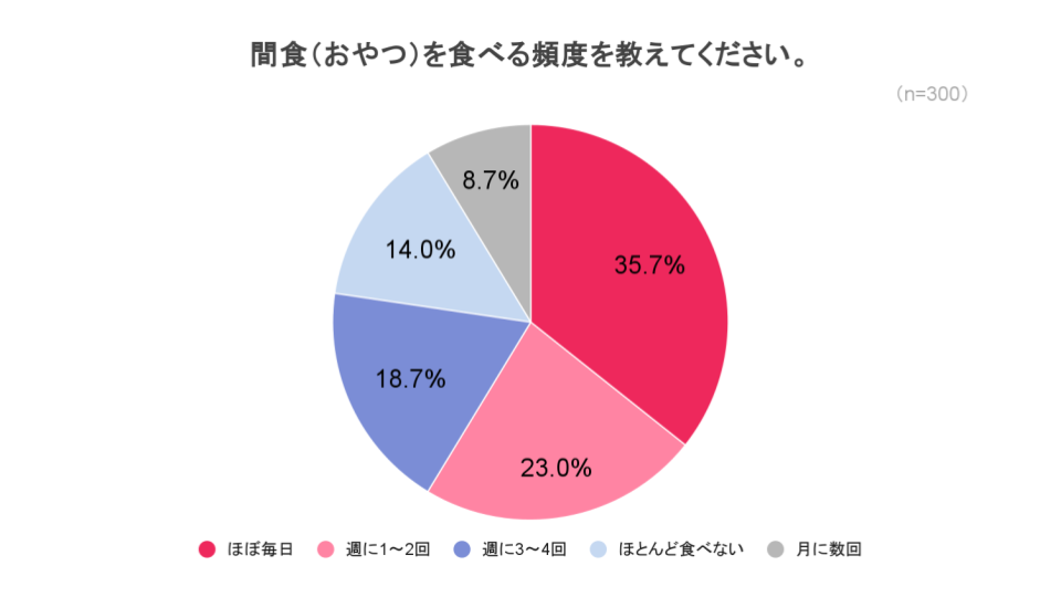 間食の頻度は「ほぼ毎日」が35.7%でトップ、「週に1〜2回」(23.0%)、「週に3〜4回」(18.7%)と続き、7割超が週1回以上間食をしていることがわかりました。