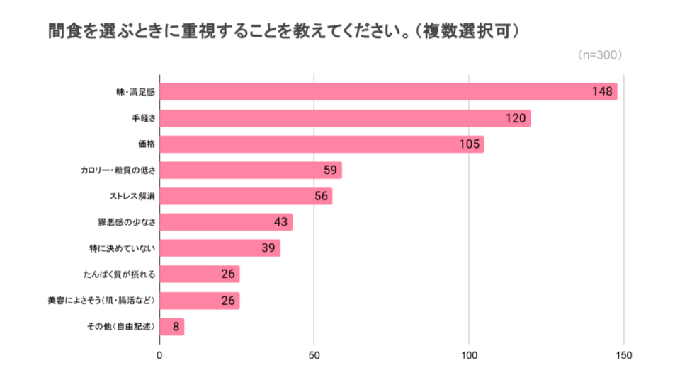 間食を選ぶ際に重視することについては「味・満足感」が148回答と圧倒的で、次いで「手軽さ」(120回答)、「価格」(105回答)。「美容によさそう」は26回答にとどまり、間食時は美容より嗜好性が優先される傾向が明らかになりました。