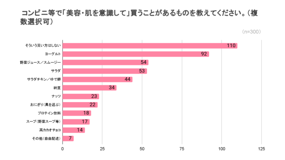 コンビニで肌を意識して買うものを尋ねたところ、「そういう買い方はしない」が110回答で最多でした。