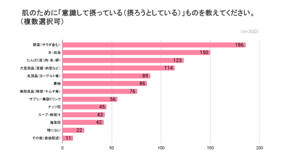 肌を意識して積極的に摂取しているものとして、「野菜(サラダ含む)」が186回答で圧倒的トップとなりました。