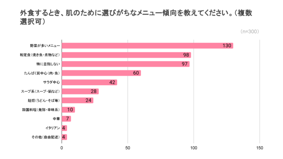次いで「水・白湯」が150回答、「たんぱく質(肉・魚・卵)」が123回答と続きます。大豆製品(114回答)や乳製品(89回答)など腸活関連の食品も上位にランクインしており、「腸と肌の関係」が広く認知されていることがうかがえます。