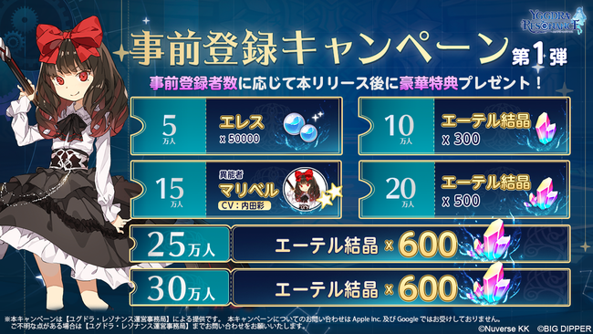 事前登録者数に応じて、ガチャ等で使える「エーテル結晶」や育成アイテム「エレス」、また異能者(キャラクター)「マリベル」など、正式サービス開始時の配布報酬が増えるキャンペーンを実施。