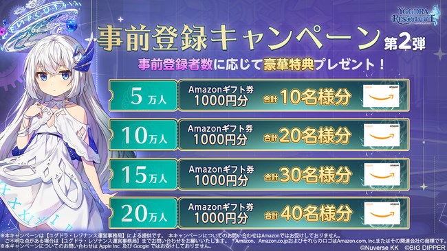 概要:ユグレゾ公式Twitterアカウントにて、事前登録受付開始を記念したキャンペーンを実施いたします。ユグレゾ公式Twitterアカウントをフォローし、キャンペーンツイートをリツイートした方の中から抽選で最大40名様に、Amazonギフト券1000円分をプレゼント!最終的な当選者数は、事前登録期間終了時の事前登録者数に応じて決定いたします。