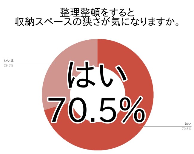 アンケートでは整理整頓をすると収納スペースの狭さが気になると答えた方が70.5%でした。全国ではさらに多い72.3%で、整理整頓をしていく上で収納スペースの狭さは全国共通の悩みであるようです。
