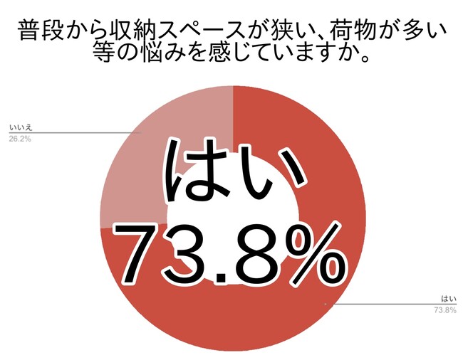 季節の節目に整理整頓をする以前に、普段から収納スペースが狭い・荷物が多い等の悩みを感じている方は関東地域で73.8%という結果になりました。全国の結果はさらに多く、74.8%でした。
