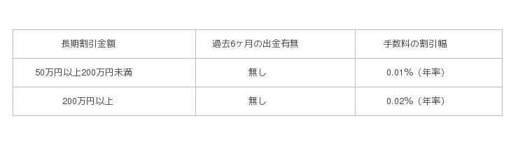 なお、出金があった場合、出金確定日(※2)が属する月の翌月(出金確定日が1日の場合は、その属する月)から手数料を通常の1.00%として再設定し、当該再設定した月から改めて「長期割」の判定を実施します。