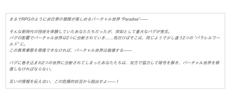 【世界観】2つに分断されたバーチャル世界で暗号を解き、バグを解消せよ!