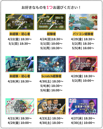 なお、「マイクラプログラミングコース」の他にも、「デジタルクリエイティブコース」「ビジネス&お金マスターコース」「ディズニーテクノロジア魔法学校コース」など3つのコースでも無料体験を開催しています。