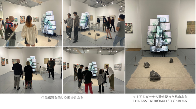 「THE LAST KUROMATSU GARDEN」は、日本の美景の象徴的存在である黒松と禅の石庭が融合した世界一静寂なフィジタルな映像彫刻です。陽の光が差し込む日本庭園に佇む1本の黒松を12台の4Kモニターが一体となり表現しています。黒松は、日本に実在する黒松を高解像度スキャンし、幹や枝のうねりやしなり、緑々しい松葉の繊細なタッチで芸術に昇華されています。樹齢300年といわれる黒松の長く静寂な時の流れの優美さを感じることができる映像作品となり、実際に世界に一つだけの特別で荘厳な日本庭園を眺めているかのような気分を味わうことができる作品です。「SCOPE MIAMI BEACH 2023」では、黒松デジタル彫刻の前方にマイアミの砂を活用した枯山水を生み出し芸術作品を完成させました。ポップな作品が多く並ぶ会場内で、静寂な本アートは一際目を引き、多くの来場者たちが足を止め、本アートの鑑賞をお楽しみいただきました。来場者からは、「ポップアートが目立つ中で、日本的な感性の作品は素晴らしい。」、また、デジタルアート制作を行うアーティストからも「今まで見たなかでも、群を抜いて美しい。」などのお声もいただき、大好評の展示となりました。