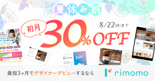 【夏休みはデザインを学ぼう!】月額料金が初月30%OFF!『夏休み割』開催中。最短3ヶ月でデザイナーを目指すならrimomo!