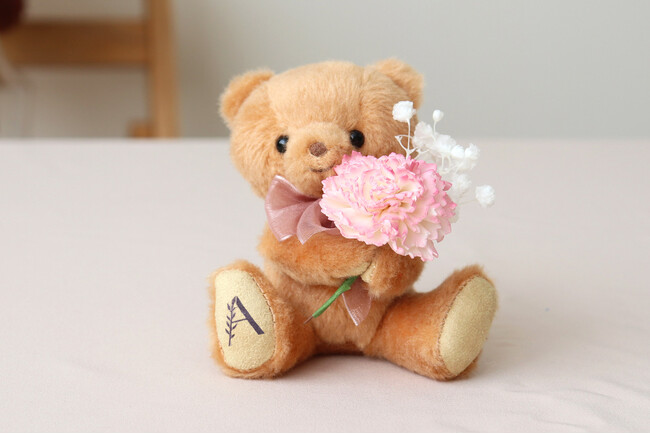 足裏にイニシャルがプリントされたテディベア「teteショコラ」が、カーネーションを抱えた新しいフラワーギフト「teteショコラフラワーギフト」がプティルウEC各店で発売開始されました。