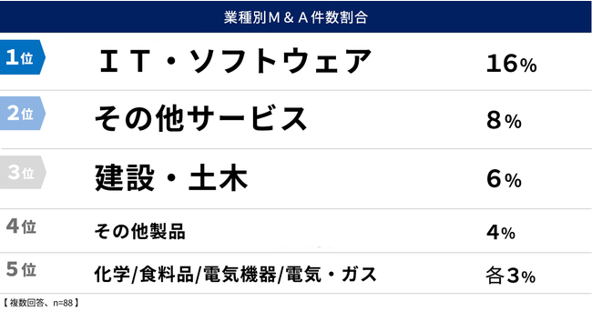 また、売り手企業の業種別のM&A件数を前年と比較すると、売り手が「建設・土木」業であったM&Aが前年比2倍に増加。また売り手が「IT・ソフトウェア」業では1.6倍に増加しました。