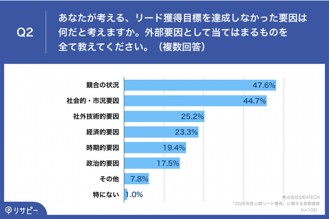 「Q2.あなたが考える、リード獲得目標を達成しなかった要因は何だと考えますか。外部要因として当てはまるものを全て教えてください。(複数回答)」(n=103)と質問したところ、「競合の状況」が47.6%、「社会的・市況要因」が44.7%、「社外技術的要因」が25.2%という回答となりました。