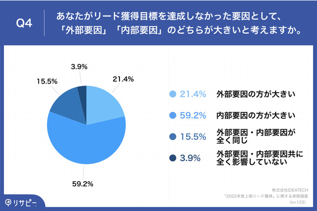 「Q4.あなたがリード獲得目標を達成しなかった要因として、「外部要因」「内部要因」のどちらが大きいと考えますか。」(n=103)と質問したところ、「外部要因の方が大きい」が21.4%、「内部要因の方が大きい」が59.2%という回答となりました。