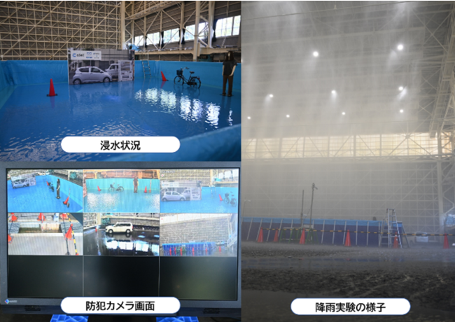 1. 実験施設内で時間雨量15mmから300mm(※5)までの降雨を発生させ、施設内に設置したプール内の浸水状況をセコムの防犯カメラで撮影してモニタリング。