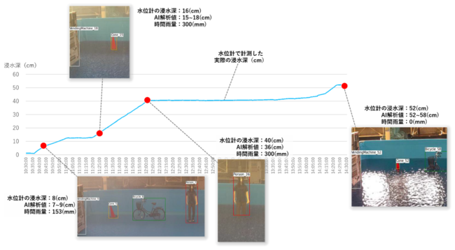 実証実験後にデータ検証を進めた結果、開発したAI解析技術によって把握した対象物の解析浸水深と、防災IoTセンサの計測値との誤差が数cm以内であったことから、発災の予兆や状況を捉えるという用途として十分に活用可能な技術であることが確認でき、実証実験は成功しました。