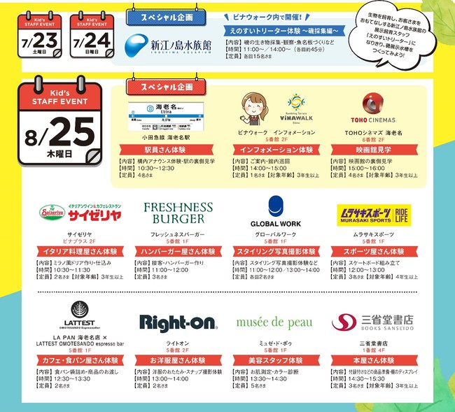 本年開催する「おしごと体験イベント」では、物販店・飲食店などのショップスタッフのほか、インフォメーション・ガードマン・クリーニングスタッフ・エンジニアなどのショッピングセンター業務や駅員業務だけでなく、湘南を代表するレジャー施設「新江ノ島水族館」の協力による飼育員体験など、6施設合計で全112メニュー、339名のお子さまにお楽しみいただけます。お子さまは多彩な業種のなかから「おしごと」を選択し応募いただけます。