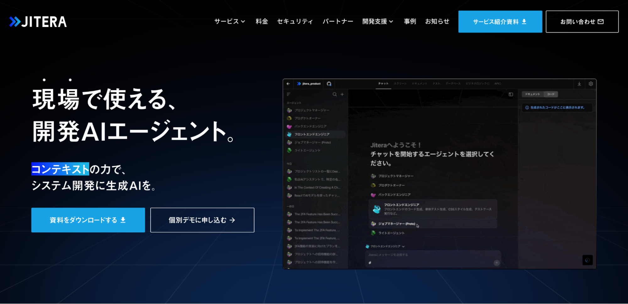 [画像2: https://prcdn.freetls.fastly.net/release_image/110428/56/110428-56-c7c7110acbea9ae38baefd97aead4386-1999x968.png?width=536&quality=85%2C75&format=jpeg&auto=webp&fit=bounds&bg-color=fff ]AIコンテキストプラットフォーム「Jitera」サービスサイトトップページ