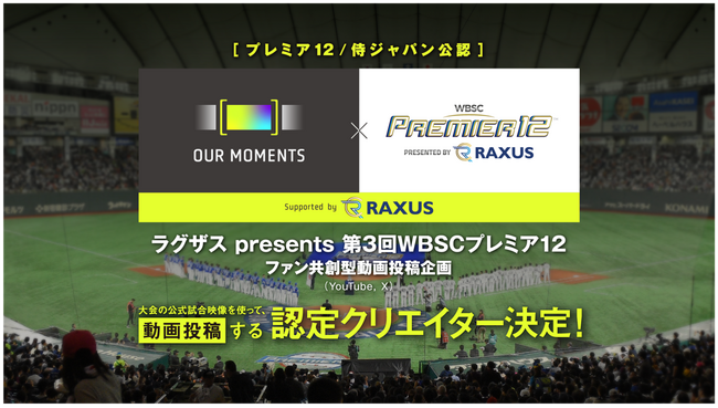 プレミア12公認企画『OUR MOMENTS』は、ラグザス presents 第3回WBSCプレミア12(以下、「プレミア12」)の試合映像をファン、クリエイターの皆様にご活用いただき、二次創作動画を共創する取り組みです。ラグザス株式会社の協賛および株式会社NPBエンタープライズの協力のもとプレミア12公認企画として、実施を発表し、多数のご応募をいただきました。