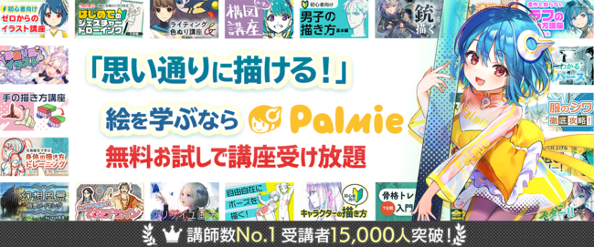 パルミーは、自宅に居ながらイラストやマンガの描き方が学べるオンライン教室です。著名クリエイターや漫画家、アニメーター、専門学校講師など、多くの「プロ」が講師を務めています。月額定額制(サブスク)で授業が受けられる「月謝制」は、累計利用者数15,000名を突破し、順調に利用者数を増やしています。