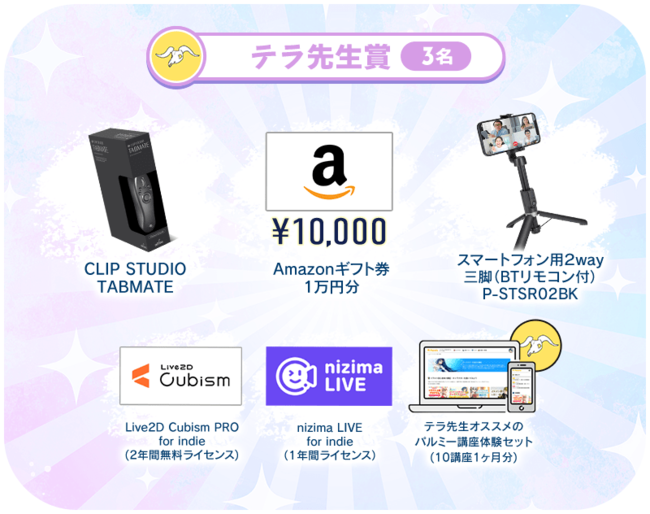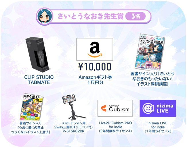 また、メインビジュアルの制作を担当した、イラストレーター・ユーチューバーのさいとうなおき先生と、イラストレーターのテラ先生を審査員に迎え、受賞者には豪華賞品をご用意しました。
