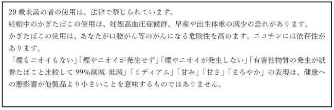 ※2 世界保健機関が紙巻たばこ煙中から低減を推奨する9種類の有害性物質の平均値に関して、リファレンス紙巻たばこ(タール約9mg)から出る煙と本製品の使用中に発生する物質とを比較した結果、99%低減されていることを意味します。本製品は依存性のあるニコチンを含みます。この表現は、健康へのリスクがないことを意味するものではありません。