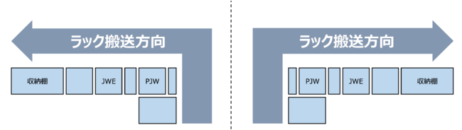 予備洗い洗浄機(プレジェットウォッシャー)をコーナーに設置するL形設置。ラック搬送向きは左右に対応いたします。