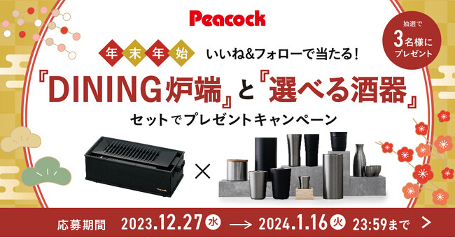 ピーコック魔法瓶工業株式会社(本社:大阪市、社長:山中千佳)は、2023年12月27日(水)から2024年1月16日(火)までの期間、お客様への日頃の感謝を込めて、Instagramの公式アカウントのフォローといいねで、「DINING炉端(WLV-50)」と「ピーコックのおうち居酒屋」シリーズの酒器1個のセットが抽選で当たる『DINING炉端と選べる酒器 セットでプレゼントキャンペーン』を開催します。