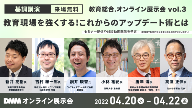 合同会社DMM.com(東京都港区、会長 兼 CEO 亀山敬司 以下、「DMM」)が展開するDMMオンライン展示会では、2022年4月20日(水)から4月22日(金)までの3日間、「教育総合.オンライン展示会 vol.3」を開催します。この度、オンラインイベント会場で視聴可能なセミナーの登壇者と講演テーマが決定いたしましたのでお知らせいたします。