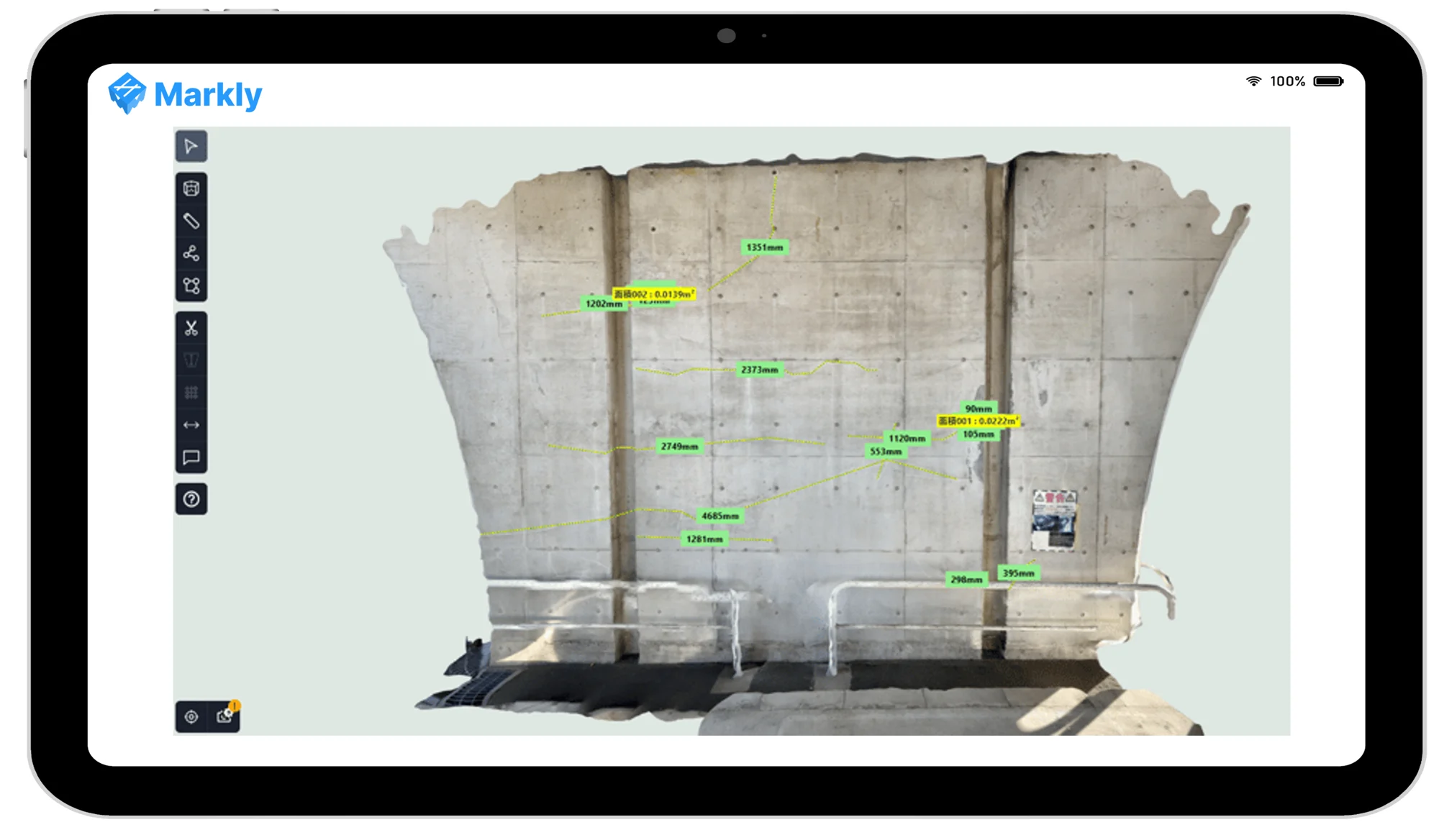 橋・トンネル等のインフラ補修時の出来形管理を効率化するクラウド型システム(従来は900分)。