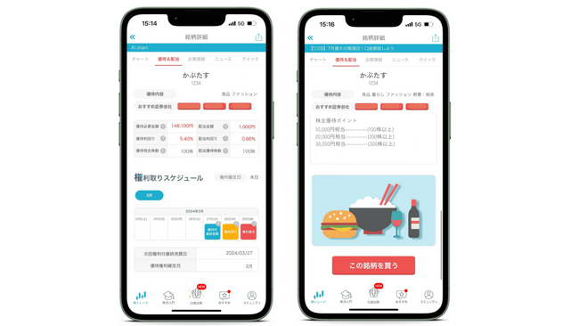 株主優待の内容を写真やイラスト付きで表示できるようになり、株主優待の内容を視覚的に把握しやすくなった他、株主優待の詳細や、受け取るまでの株主権利取得のスケジュール等の最新情報もわかりやすくお届けしています。これにより、株式投資の初心者の方でも、カタログ感覚で株主優待情報を楽しみながら、株式投資先選びにお役立ていただくことができます。