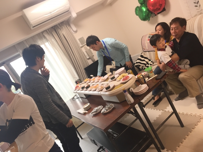 ご自宅での本格的な回転寿司に皆様驚きの声をあげ、お祝いのムードで和気藹々とした中、約200皿計400貫分ものお寿司をお楽しみいただきました。