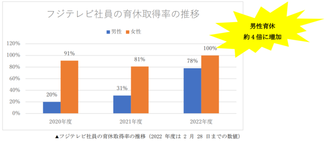 これらの結果、フジテレビ社員の育休取得率は年々高まっており、2022 年度の男性育休取得率は 78%(2月 28 日までの数値)と国の目標とする 30%を大きく上回りました。