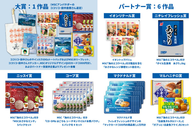 大賞:ココリコ・田中さんのサイン入りSDGsトートバッグおよびMSCのリーフレット、ココリコ・田中さんステッカー、MSCオリジナルデザインQUOカード(5000円分)、イオントップバリュMSC「海のエコラベル」付き製品を含む「おさかなレンジ調理セット詰合せ」、ニチレイフレッシュ MSC「海のエコラベル」付き「ボイル あさり」(1kg)、ニッスイ MSC「海のエコラベル」付き「MSCおさかなミンチ」3パックセット、日本生協連 MSC「海のエコラベル」付き「CO·OP&はごろも シーチキンマイルド水煮パウチ」6パック、マクドナルド、MSCオリジナルデザイン「マックカード(500円の商品券)」2種類セット、マルハニチロ MSC「海のエコラベル」付き「白身魚タルタルソース」と「ガブッと!白身魚フライ」セット