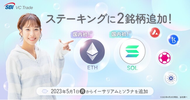 SBI VCトレード株式会社(本社:東京都港区、代表取締役社長:尾崎 文紀、以下「当社」)は、2023年5月1日より、「ステーキングサービス」取扱銘柄にイーサリアム(ETH)、ソラナ(SOL)を追加することをお知らせいたします。ETH、SOLともにステーキングサービスでの取扱は国内初となります。