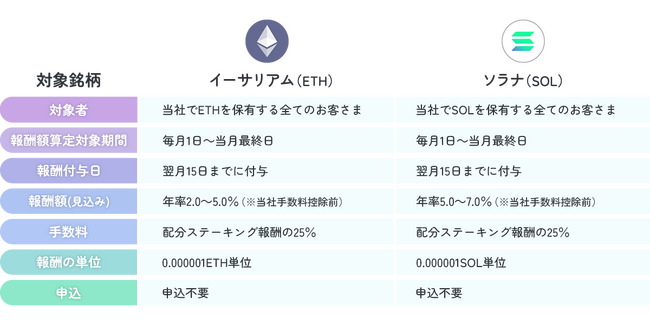 国内初!「ステーキングサービス」にイーサリアム(ETH)、ソラナ(SOL)追加のお知らせ~ETH、SOLともに国内初!ステーキングサービスの取扱銘柄は6銘柄へ ~